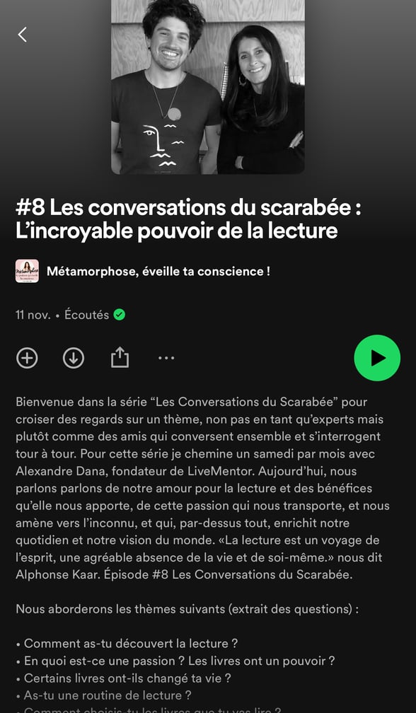 L’épisode “Les conversations du scarabée : L’incroyable pouvoir de la lecture.” du podcast Métamorphose, éveille ta conscience. J’ai pris tellement de plaisir à écouter cet épisode. D’abord parce que Anne et Alexandre sont apaisants et transmettent à merveille leur passion respective pour la lecture et aussi parce que je me suis reconnue en de nombreux points. En l’écoutant, j’ai été émue, j’ai souri, j’ai lancé tout haut des “mais oui, c’est tout à fait ça !” et ressenti de la joie. De la joie parce que, ça m’a rappelé ma croyance profonde que quand on lit, on ne se sent jamais seul et on ne connait pas l’ennui.